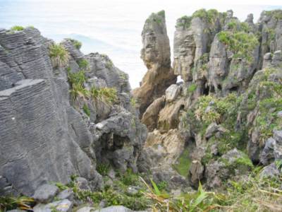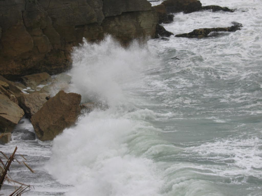 Further down the highway we stopped on an impulse for a sign that advertised, "Pancake Rocks and Blowhole" which also turned out to be spectacular. The pancake rocks are sedimentary rocks that have particularly defined layers and have eroded to look a bit like stacked pancakes. The whole area has been carved away by the surf to create caves and holes for the surf to flow through. We were again lucky to catch a break in the rain to go look, but we both froze as the wind picked up sea spray and drove it into our bones. It's impossible with just a few shots to give a good idea of what it looked like, but this picture gives a good idea of how stormy the seas were. The waves were pounding into the rocks every few seconds--at one point we saw some foam picked up by the wind and blown away like bubbles.