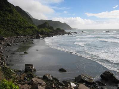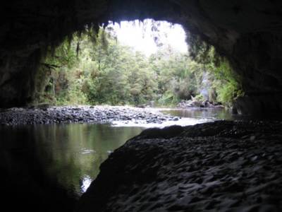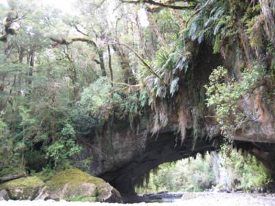 As packed as Monday was, Tuesday turned out to be just as spectacular. We woke up in our Karamea camp site to the sound of rain. Clearly, it had been raining most of the night and showed no signs of letting up. We decided to head back into the Oparara Basin anyway because our main destination was a couple of caves that are open for exploring so we figured we'd be out of the rain. When we got back into the basin we were stymied by some work being done on a bridge, so we couldn't get all the way to the caves. The rain had calmed to a intermittent drizzle, so we hiked to the other limestone arch in the area, called Moria's Gate. With all of the Lord of the Rings filming sites scattered about New Zealand I was taken with the coincidence, but it really appears there's no relation (unless Tolkien saw the name and borrowed it for his dwarven kingdom or a geologist who had read the book named the arch.)