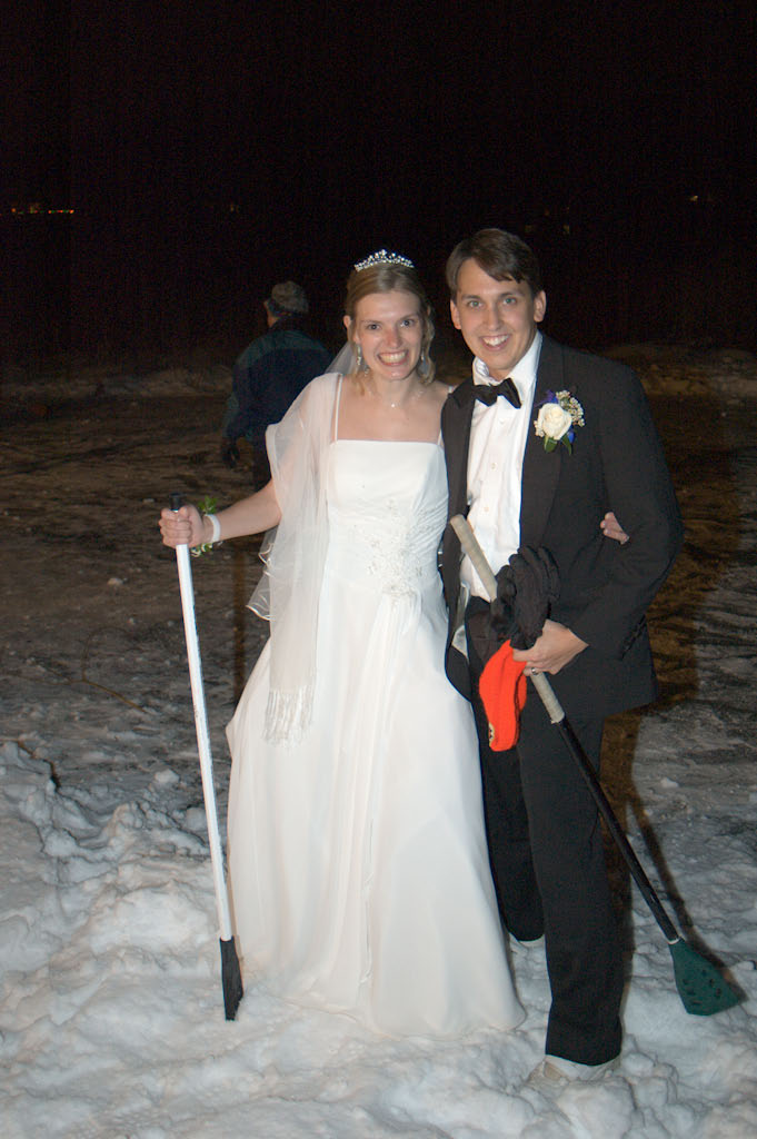 Broomball was included on the formal invitation to the reception. After cutting the cake, Talisyn put on her boots and a scarf to kick off the game. She only played in her wedding attire for about 10 minutes before she changed into warmer clothes, but her willingness to brave the elements bespeaks her eagerness and good humor.