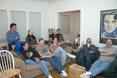 This photo is the only bachelor party picture that is authorized for release. Although it looks posed, these are genuine reactions to the video game that they are playing.