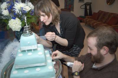 Andy's wedding gift to Randy and Talisyn was this tiered cheesecake that he and his friend Siobhan made and decorated. In the months preceding the reception, they experimented with crust height, cake density, fondant and all the other technical aspects of cake decorating. Although Andy and Siobhan concluded that there is a reason no professional outfit offers tiered cheesecake, the cake tasted delicious and looked gorgeous.