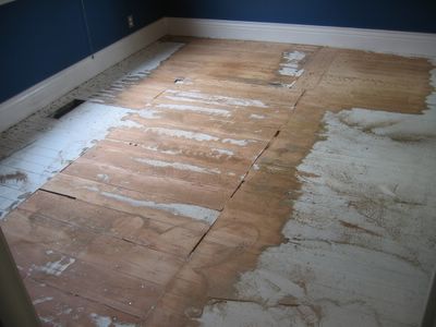 The terrible state of our living and dining room floors has prompted many theories; our favorite is that the surface shrouded in white paint is the subfloor. That theory is why we decided to lay new floors rather than sand and refinish the (in our minds) non-existent flooring.