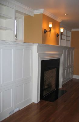 This is what our fireplace wall looked like when we got home. The cabinets and drawers need some more fine tuning, some paint needs to be fixed, and we need to find cabinet knobs and drawer pulls before we can move in.
