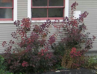 This is the view from our stairwell window. In the summer the leaves were deep purple; now they are turning hot pink. I smile every time I see it, which is every time I go up the stairs. The picture doesn't do it justice and it shows the dead plant in front of the bushes. :)